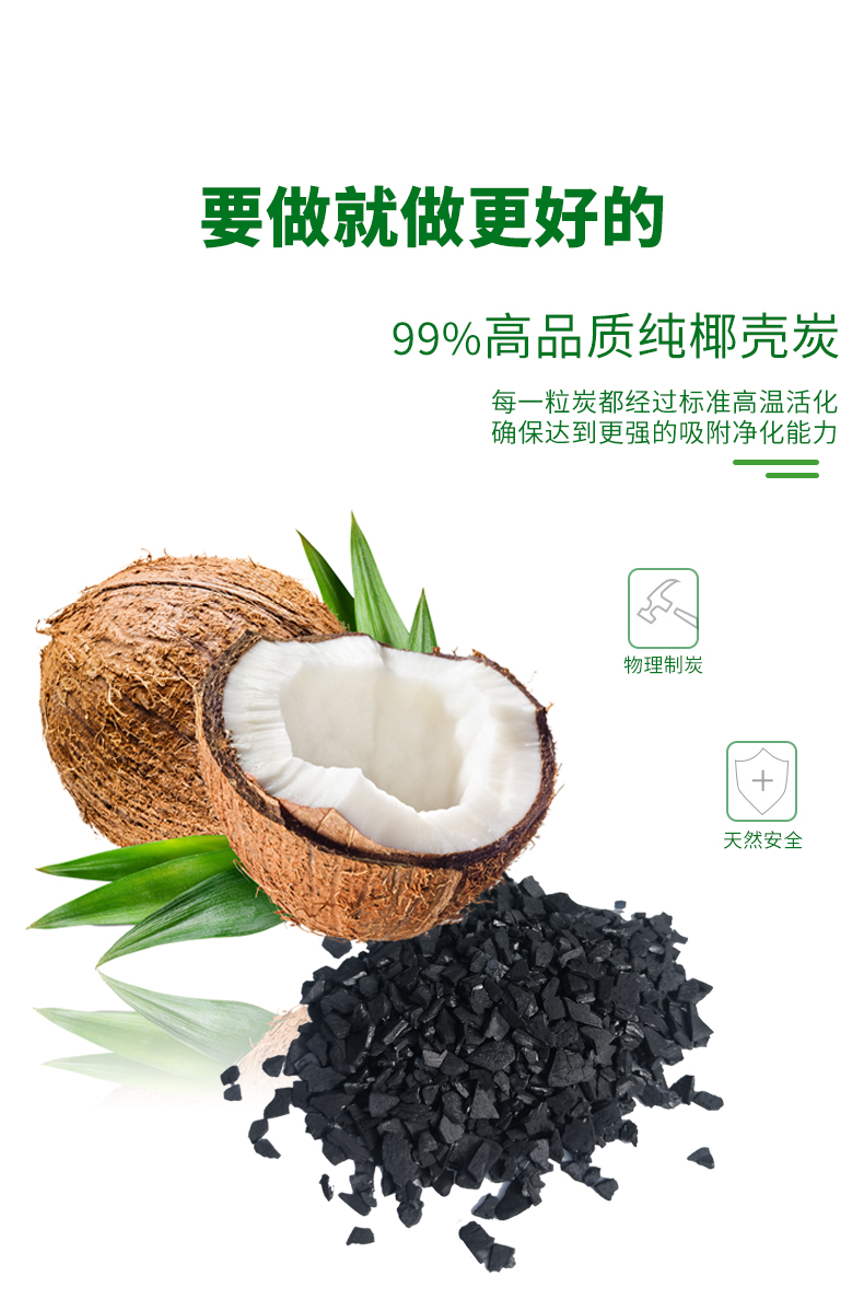 2、椰殼活性炭是以優(yōu)質(zhì)椰子殼為原料,經(jīng)系列生產(chǎn)工藝精加工而成。