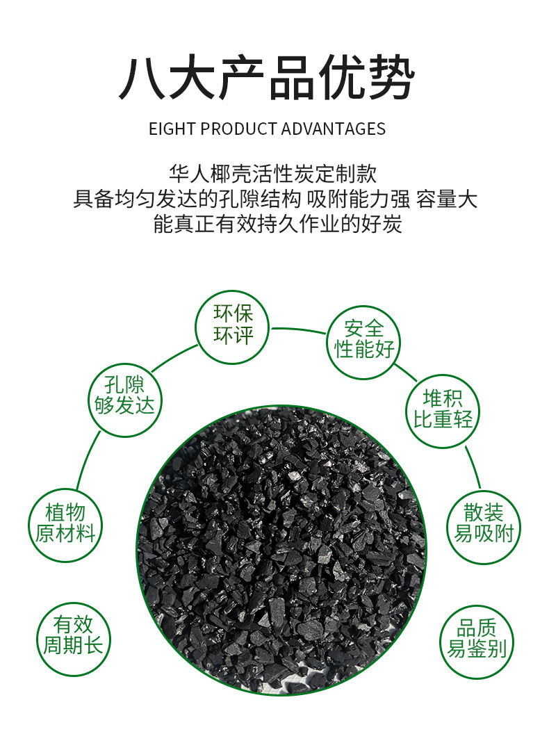 本品采用優質椰殼、杏殼、核桃殼等堅硬果殼為原料,經物理的方法精制而成。產品為黑色不定型顆粒狀,具有比表面積大、孔隙結構發達、吸附能力強、脫色速度快、易再生等優點。