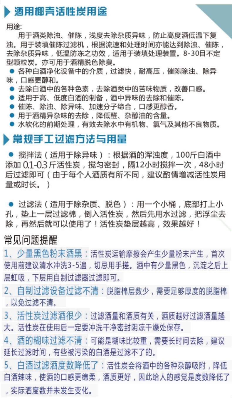 酒用活性炭是疏水性吸附劑,能有效去除引起白酒渾濁的物質和異雜味。高度原酒的用量為3‰,低度白酒的用量為1‰;高度原酒作用時間為24h,低度白酒的吸附時間為12h。有關于酒用活性炭的相關問題可以隨時聯系咱們。王經理:18638723888,隨時為您解答疑惑。