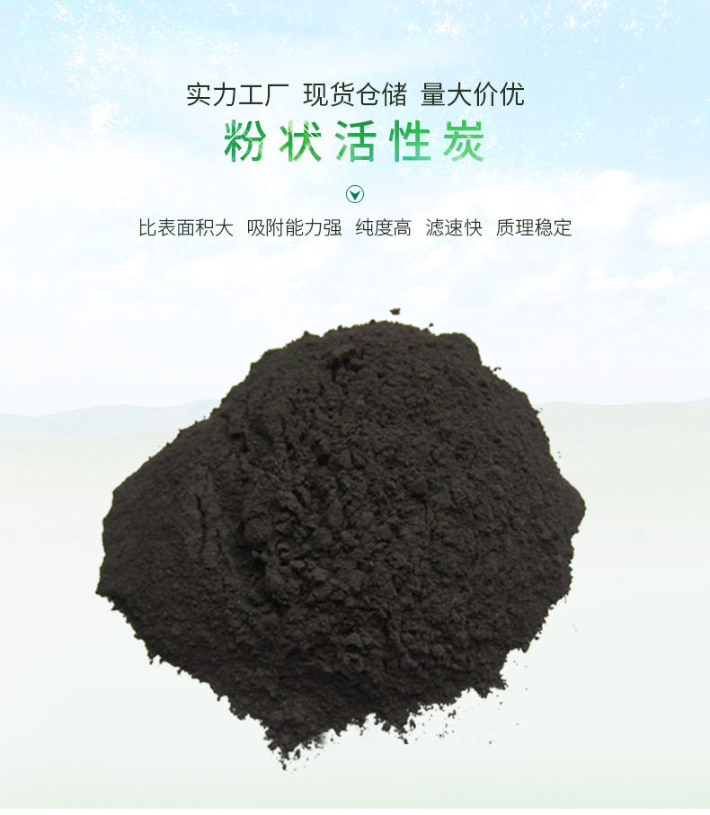 性質:工業水處理粉狀活性炭以優質果殼和木屑為原料,經蒸汽活化后,精制處理,粉碎而成,外觀為黑色細微粉末狀,無毒、無味,具有比表面積大,吸附能力強。