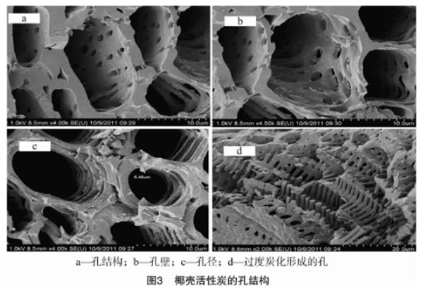 從圖3可以看出,椰殼活性炭的孔結構較為發達,孔的大小也比較均勻。在大孔的孔壁上,可以清楚地觀測到有較小的孔存在(圖3-a),小孔的大小也比較均勻,而且在孔結構比較多的部分位置,孔壁甚至以網狀結構出現(圖3-b)。椰殼活性炭表面比較均勻的孔直徑約為5-10um(圖3-c)。在部分活化過度的位置(圖3-d),可以清楚地看出即使椰殼活性炭的表面看起來的孔較少,但是內部仍然具有非常發達的孔結構。