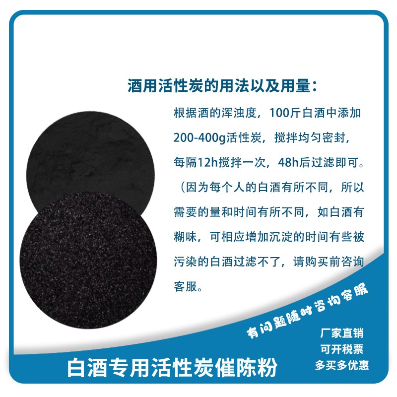 白酒生產(chǎn)中由于發(fā)酵、蒸餾等操作不慎,使白酒帶有苦味,有市售苦味掩蓋劑不能很好地解決,日本專(zhuān)利(特公昭60~17504)稱,制成堿性含氮活性炭可有效地去除苦味,用量為0.1%-0.4%。