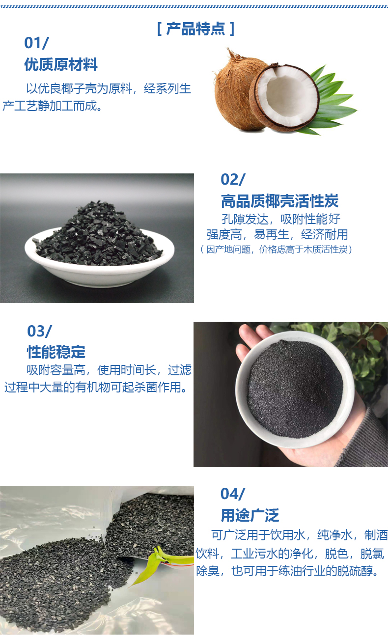 5: 飲用水用椰殼活性炭:活性炭用于家庭直接飲用水、自來水廠水處理、桶裝水生產(chǎn)的深度水凈化。